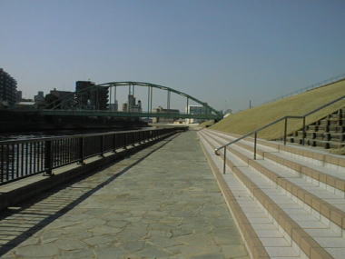 荒川と新河岸川との間の土手につくられた遊歩道上の緑地。
